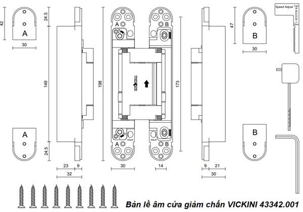 💡 Ứng dụng: Bản Lề Âm Cửa Giảm Chấn VICKINI 43342.001 là lựa chọn lý tưởng cho các loại cửa kim loại, gỗ có độ dày trên 45mm, đặc biệt phù hợp với cửa phòng khách, cửa chính, cửa văn phòng, cửa phòng ngủ và các loại cửa có yêu cầu về sự êm ái và thẩm mỹ.