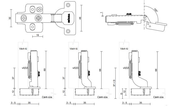 - Chỉnh cao – thấp, trái – phải, trước – sau giúp căn chỉnh cửa tủ dễ dàng, nhanh chóng.