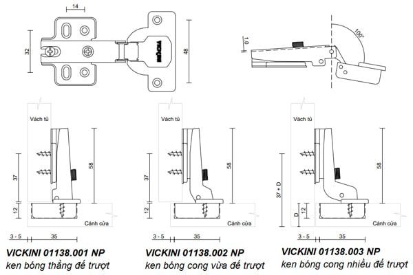 🔹 3. Bản lề bật VICKINI 01138.003 NP – Ken bóng cong nhiều đế trượt