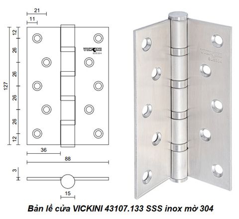 Bản lề cửa VICKINI 43107.133 SSS inox mờ 304, 1.25T dày 3.0mm