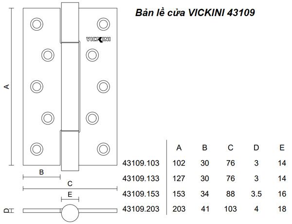 - Bản lề cửa VICKINI 43109.103 OBP đen mờ 201, 1T dày 3.0mm