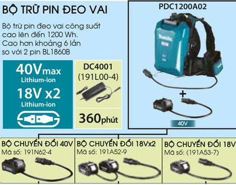 - Công dụng của bộ chuyển đổi pin 18V Makita 191A53-7 là nó lấy nguồn điện của bộ trữ pin đeo vai PDC1200A02 sang nguồn điện 18V phục vụ cho các máy dùng pin 18V