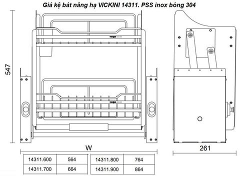 - Giá kệ bát nâng hạ VICKINI 14311.600 PSS inox bóng 304