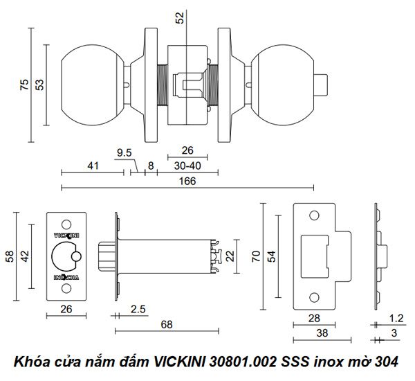 - Khóa cửa nắm đấm VICKINI 30801.002 SSS inox mờ 304