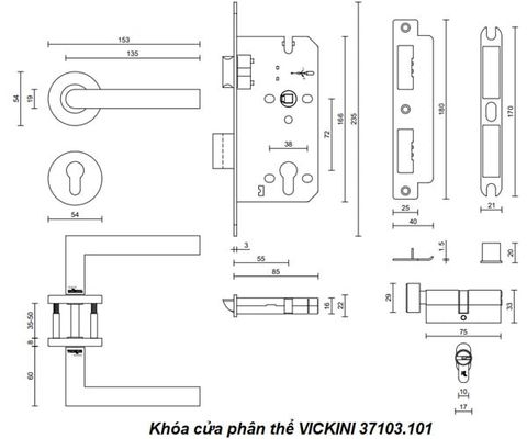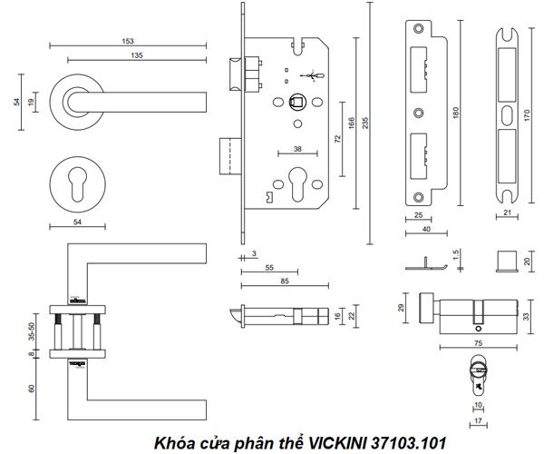 - Khóa cửa phân thể VICKINI 37103.101 SSS inox 304 mờ, ruột chốt