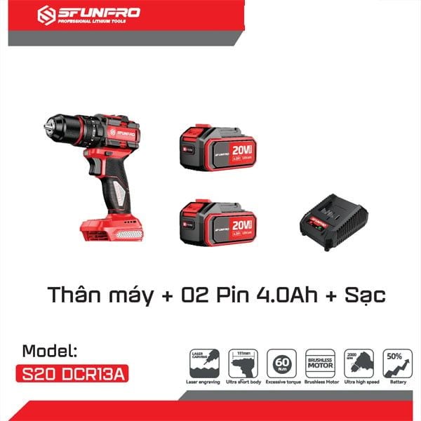 👉 SFUNPRO S20 DCR13A 4A – Giải pháp tối ưu cho công việc khoan, siết vít và khoan búa mạnh mẽ, chuyên nghiệp!