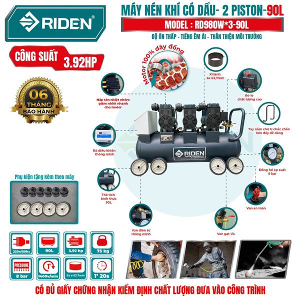 - Máy nén khí không dầu 2.94KW bình 90L Riden RD980Wx3-90L Sở hữu độ ồn chỉ bằng 1/3 máy nén khí có dầu. Model RD980Wx3-90L thân thiện với môi trường, giúp môi trường làm việc của bạn thoải mái, dễ chịu hơn.