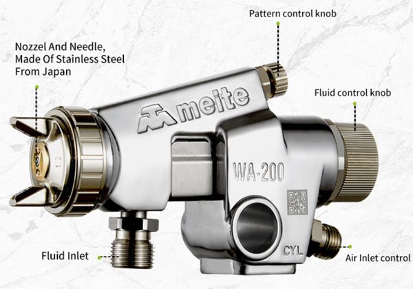 - Súng phun sơn tự động Meite WA-200 này được thiết kế để giúp việc sơn trở nên dễ dàng và hiệu quả nhờ khả năng điều chỉnh áp suất không khí và kiểu quạt.