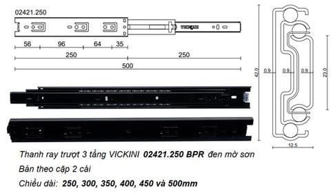 - Thanh ray trượt 3 tầng VICKINI 02421.250 BPR đen mờ sơn
