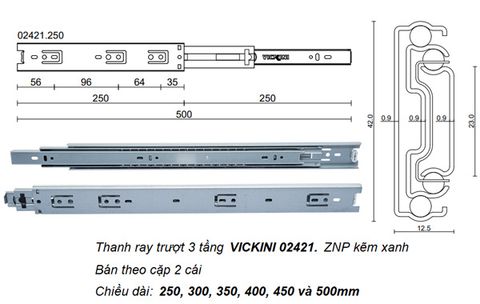 - Thanh ray trượt 3 tầng VICKINI 02421.250 ZNP kẽm xanh