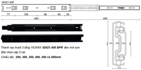 - Thanh ray trượt 3 tầng VICKINI 02421.400 BPR đen mờ sơn