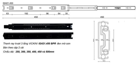 - Thanh ray trượt 3 tầng VICKINI 02421.450 BPR đen mờ sơn