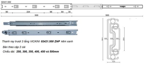 - Thanh ray trượt 3 tầng VICKINI 02421.500 ZNP kẽm xanh